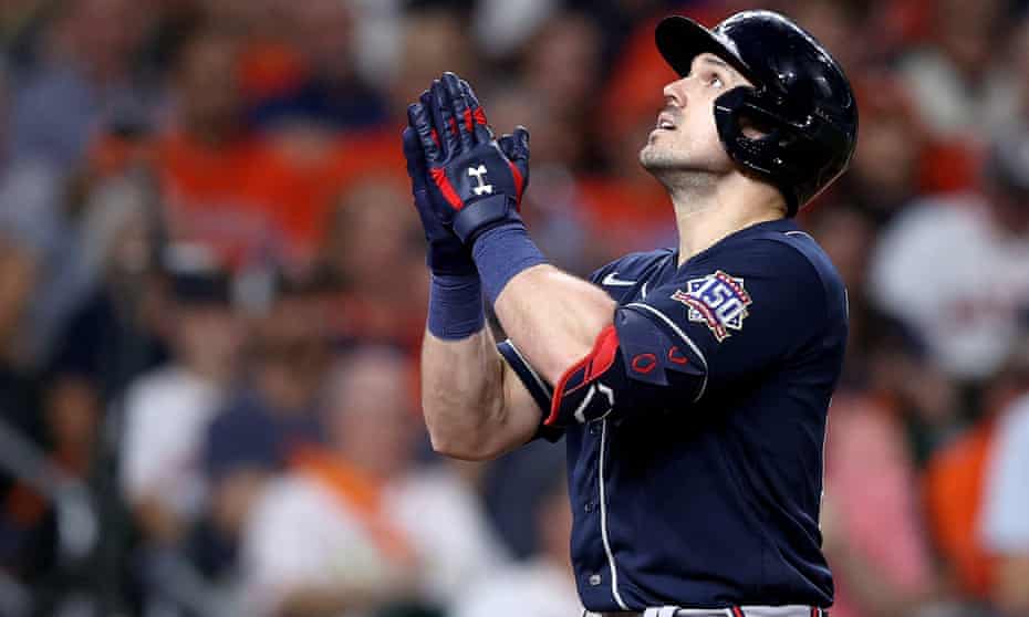 Underdog Braves took down defending World Series champion Dodgers four games to two in NL Championship Series after blowing 2-0 and 3-1 leads against Los Angeles in 2020 NLCS. Fans cheer as the Houston Astros and the Atlanta Braves line up for the national anthem prior to the first pitch of Game One of the World Series at Minute Maid Park on Oct. The Braves got on top of the Astros early scoring a quick five runs off Houston starter Framber Valdez.